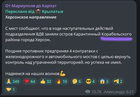 Ближче до кінця тижня більшість ворожих джерел визнала свою брехню і спробувала акуратно “з’їхати” з теми. Найвпертіші ж продовжують розповідати про “захоплений Острів” та навіть “звільнення кількох населених пунктів на правому березі”. Ніяких фото чи відео підтвердження перебування російських штурмовиків у Херсоні за ці дні опубліковано не було.