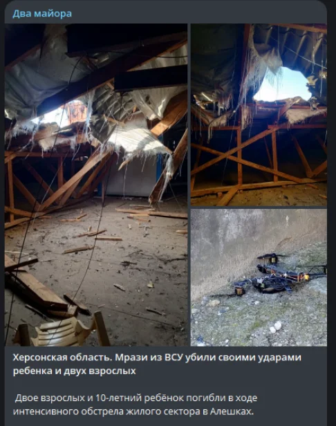 “Альошкінський МО зазнав атаки БПЛА з боку збройних формувань України по мирному населенню. У місті Альошкі в житловому будинку тяжко поранено неповнолітнього Ваню 2015 року народження. Осколкові поранення легенів, печінки та серця. Доставлений до лікарні, але помер. Лікарі боролися за життя хлопчика, проте поранення були несумісні з життям”.
