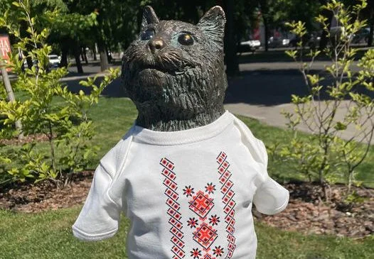 У День вишиванки скульптура «Щедрого котика» в черкаському міському сквері “Юність” також одягнули у вишиванку.