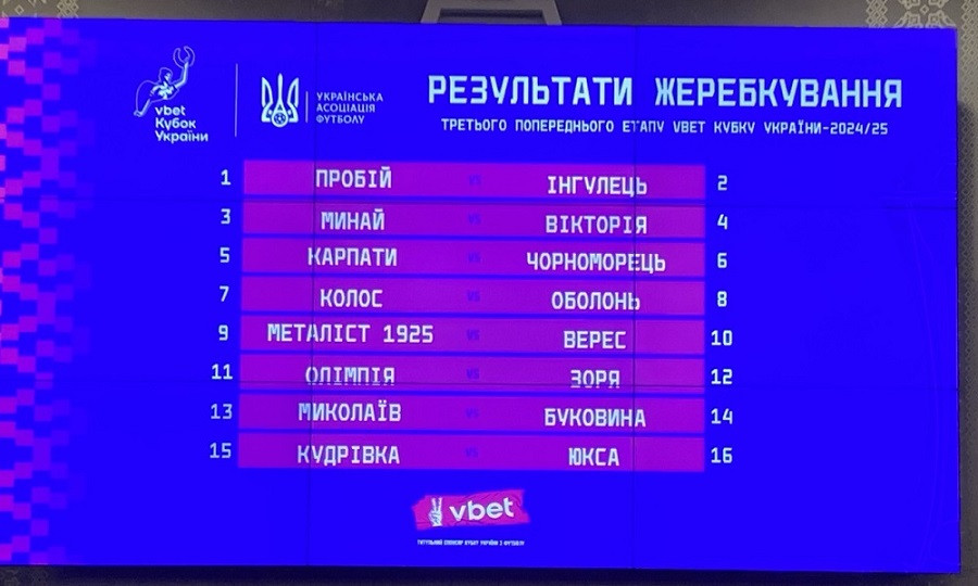 Сьогодні в Будинку футболу відбулася процедура жеребкування третього попереднього раунду Кубку України сезону-2024/25, на якому до числа учасників (дев’ять переможців другого попереднього етапу) долучилися сім клубів Української Прем’єр-Ліги — «Зоря», «Колос», «Чорноморець», «Верес», «Оболонь», «Інгулець» та «Карпати».