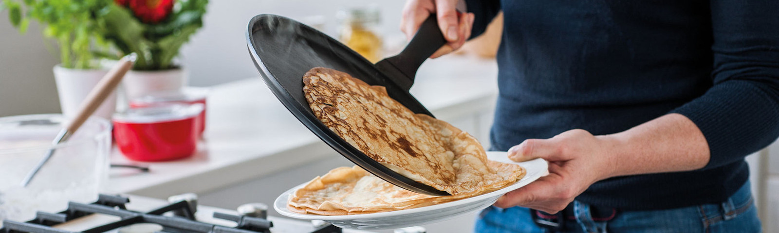 Лично я использую Tefal Crepe 25 см и могу отметить, что даже при интенсивной эксплуатации покрытие сохраняет свои свойства достаточно долго, а блин легко переворачивается и не прилипает.