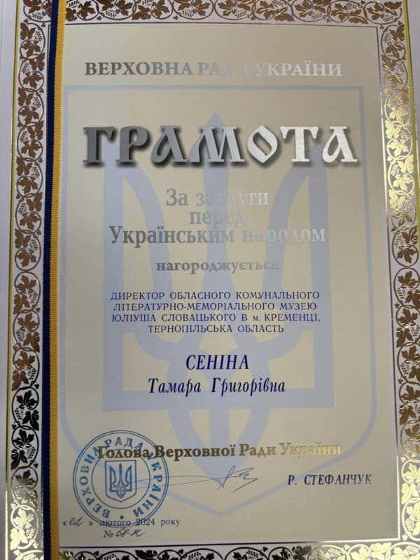“Мав за честь, разом з своїм колегою Іван Калаур, директором департаменту культури та туризму Тернопільської ОВА Світланою Байталюк, головою ВЦА кременецького району Віталій Кудлак, передати грамоту Верховної Ради «За заслуги перед Українським народом» Директору Обласного Комунального Літературно-Меморіального Музею ЮЛІУША СЛОВАЦЬКОГО в м. Кременець Сеніній Тамарі Григорівні,” – написав Ігор Василів.