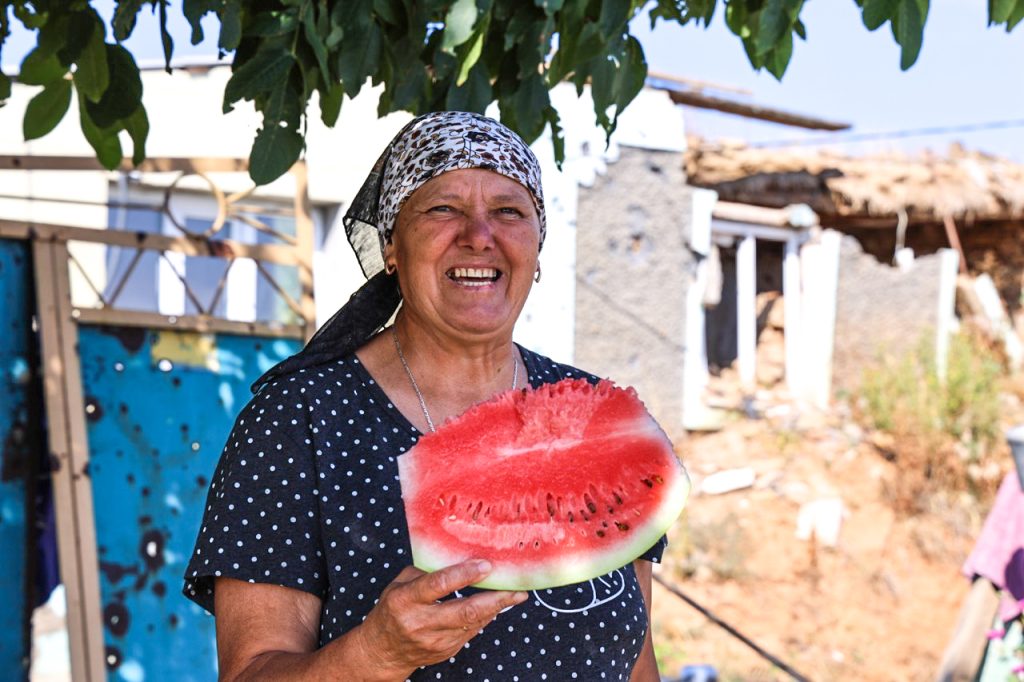 In front of her and her husband’s yard, in the shade of a large walnut tree, huge watermelons are stacked, and scales stand nearby. While her husband is working on the field, Tetiana invites us to taste the watermelons.