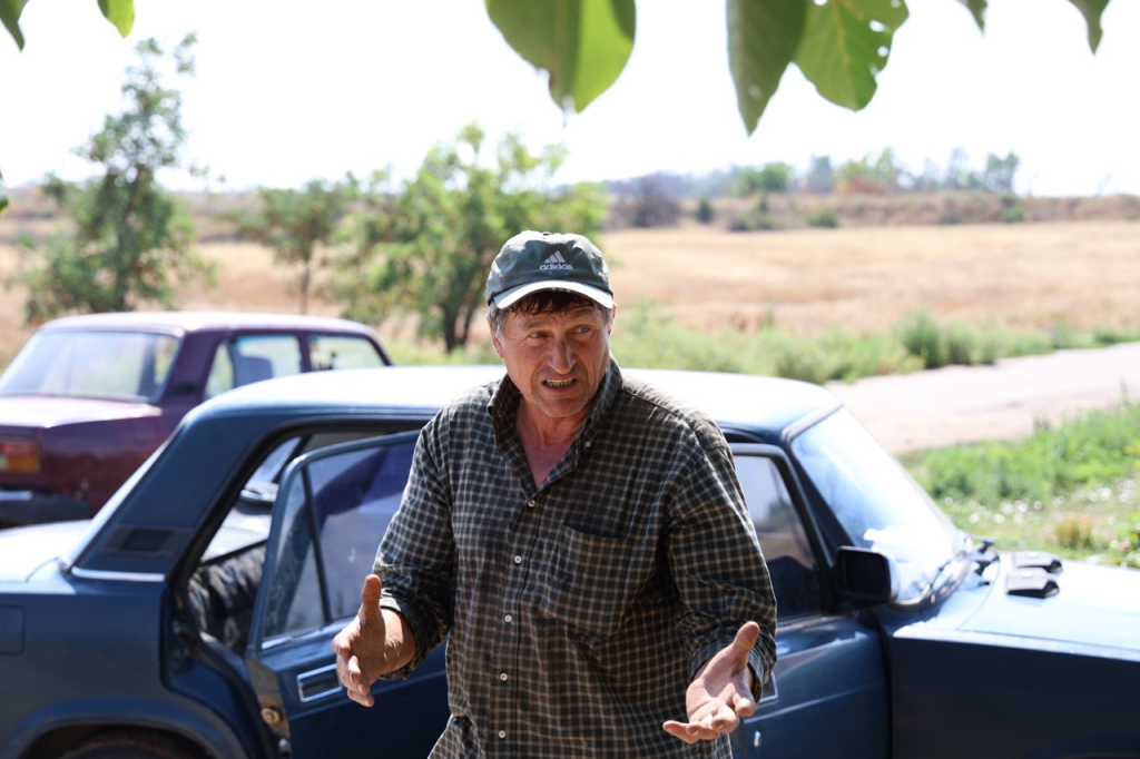We are having a leisurely conversation about this, savoring the pink juicy flesh of a watermelon, when an old green Zhiguli turns into the village from the highway. The owner of the vintage Soviet car is a tall, smiling man in his late sixties. He is traditionally dressed in old classic suit pants that he may have worn to someone’s wedding, a cowboy shirt with the sleeves rolled up three-quarters of the way and an Abibas type baseball cap. This outfit makes Serhiy look like an American farmer, and his charisma makes him look like a congressman from Ohio.