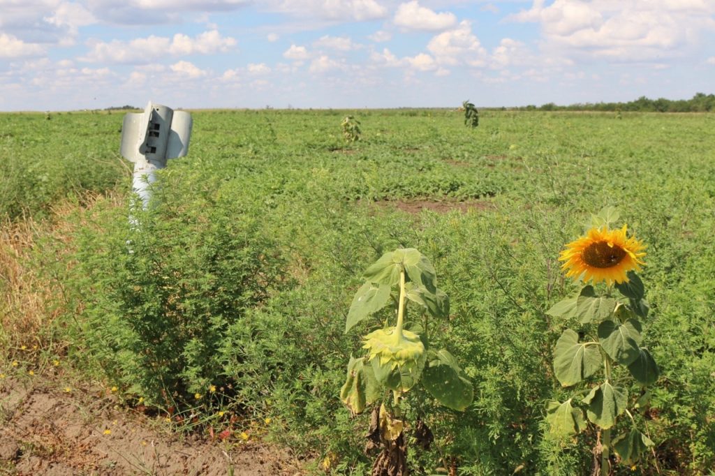 Despite the conditional clearing of mines, the field still contains dangerous equipment. In the middle of the field there is a sign “Attention! Mines”. Underneath the sign is an element of a cluster shell.