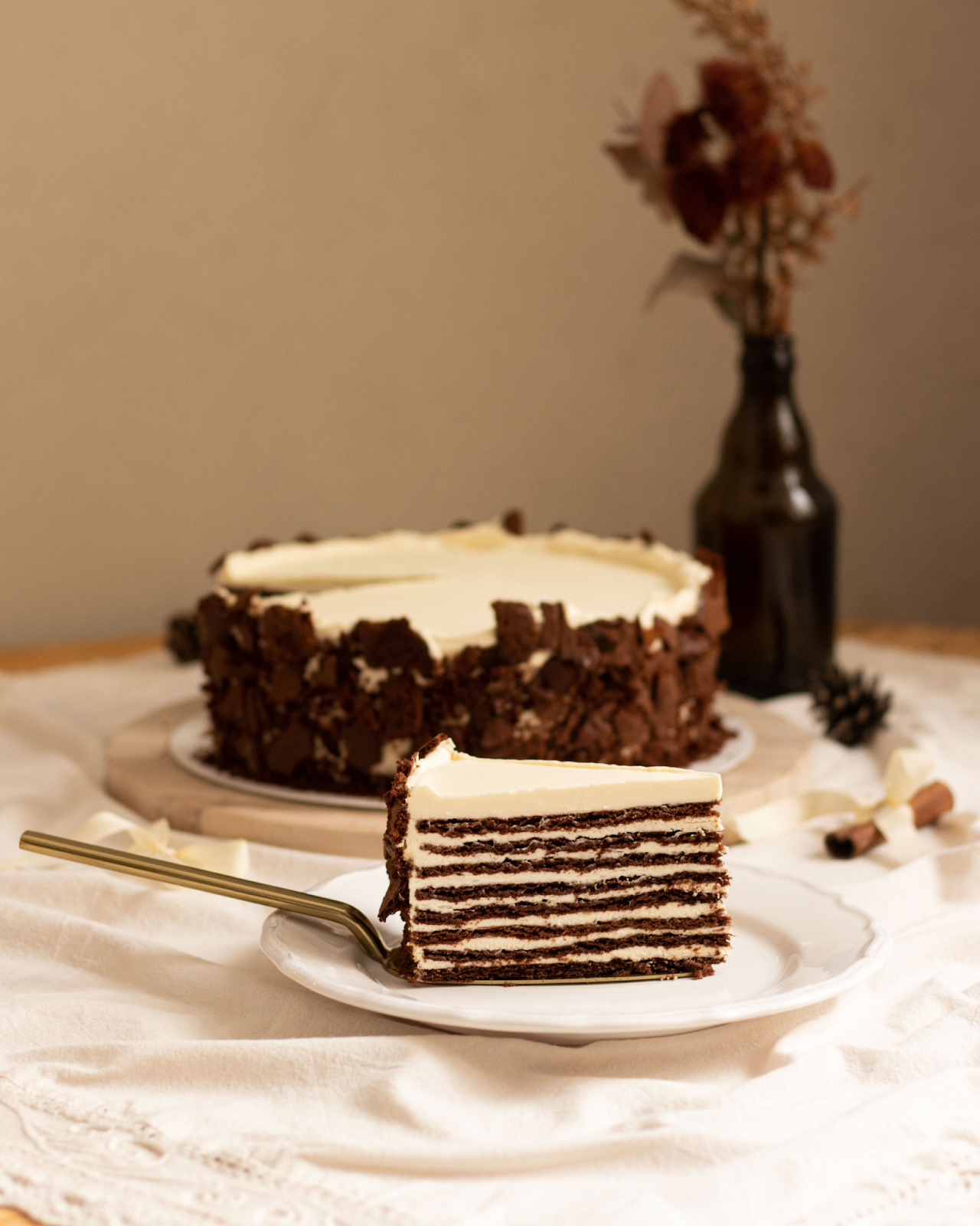 3. Спартак — нежный десерт, который тоже состоит из медового теста, но с добавлением какао. Тоненькие коржи хорошо пропитываются масляным или заварным кремом, поэтому торт получается очень нежным.