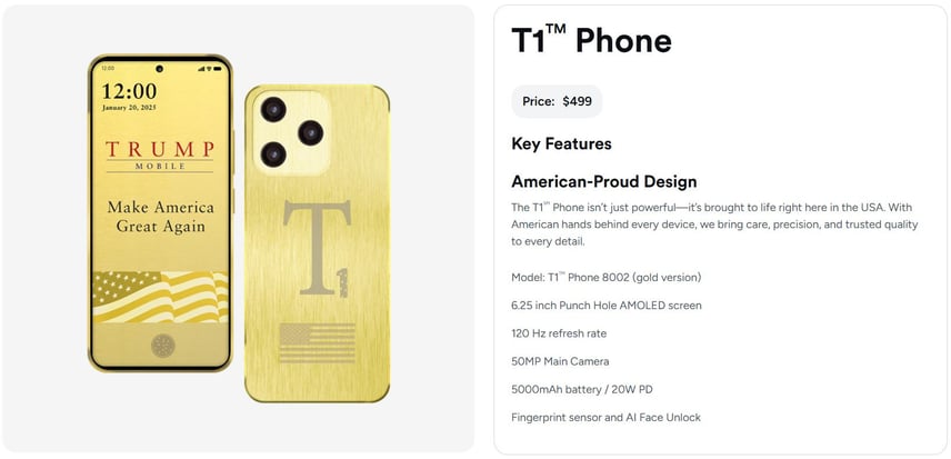 Окрім цього, компанія презентувала «елегантний золотий» T1 Phone — смартфон, який, як стверджувалося, виготовлятиметься у США, та коштуватиме 499 доларів.
