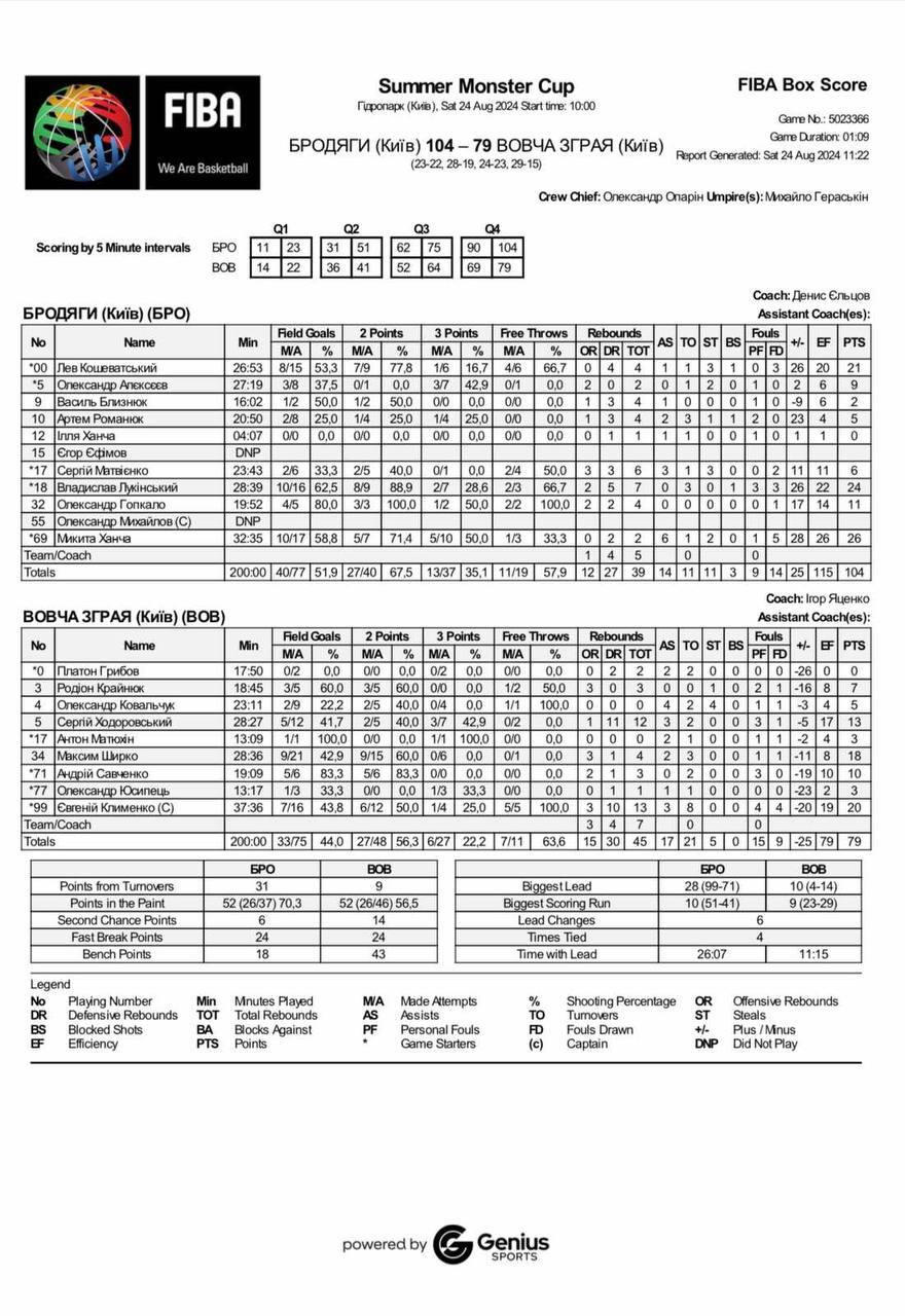 У першому матчі гравці команди Бродяги легко переграли команду Вовча зграя. Найбільший внесок у перемогу зробили гравці Микита Ханча (26 очок), Владислав Лукінський (24), Лєв Кошеватський (21).