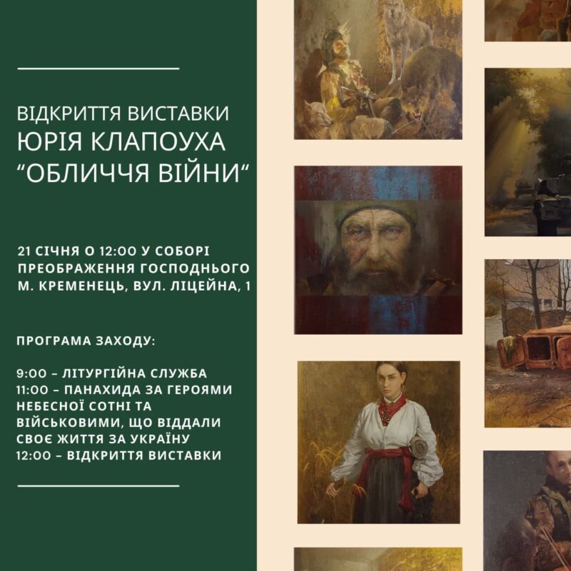 Незабаром у Преображенському соборі в Кременці відкриють виставку відомого художника Юрія Клапоуха. Митець за освітою також інженер за спеціальністю «Літальні апарати та силові установки». Його ж образотворчі роботи відомі своєю реалістичністю.