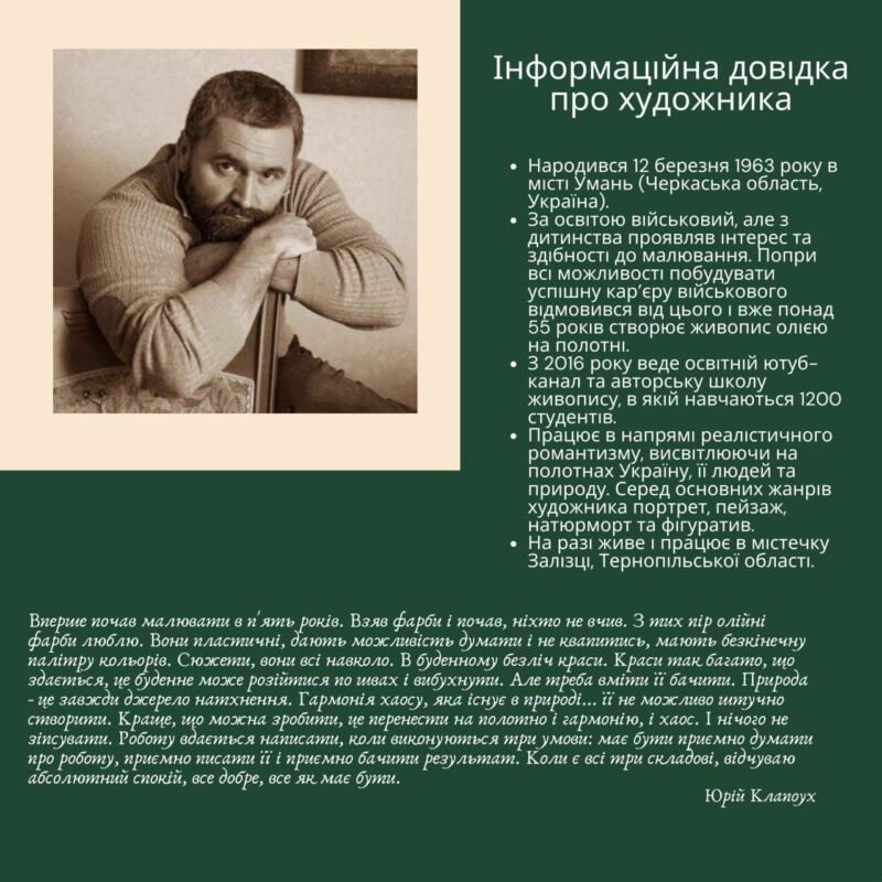 “У неділю, 21 січня 2024 року о 12:00, відбудеться відкриття виставки картин Юрія Клапоуха –