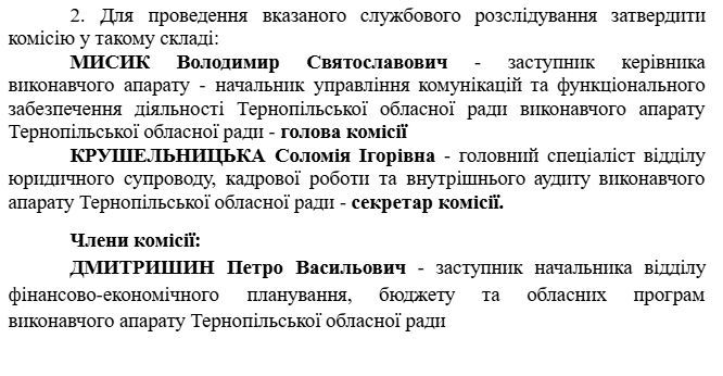 “На підставі отриманого 21 січня 2025 року подання Управління стратегічних розслідувань в Тернопільській області Департаменту стратегічних розслідувань від 17 січня 2025 року № 7447-2025 (в порядку статті 65-1 Закону України «Про запобігання корупції»), Порядку проведення службового розслідування, затвердженого постановою Кабінету Міністрів України від 13 червня 2000 року № 950, (у редакції постанови Кабінету Міністрів України від 07 березня 2023 року № 246). Провести службове розслідування стосовно виконувача обов’язків на посаді директора комунального підприємства теплових мереж Тернопільської обласної ради «Тернопільтеплокомуненерго» Бочкарьова Миколи Миколайовича”, – йдеться у документі.