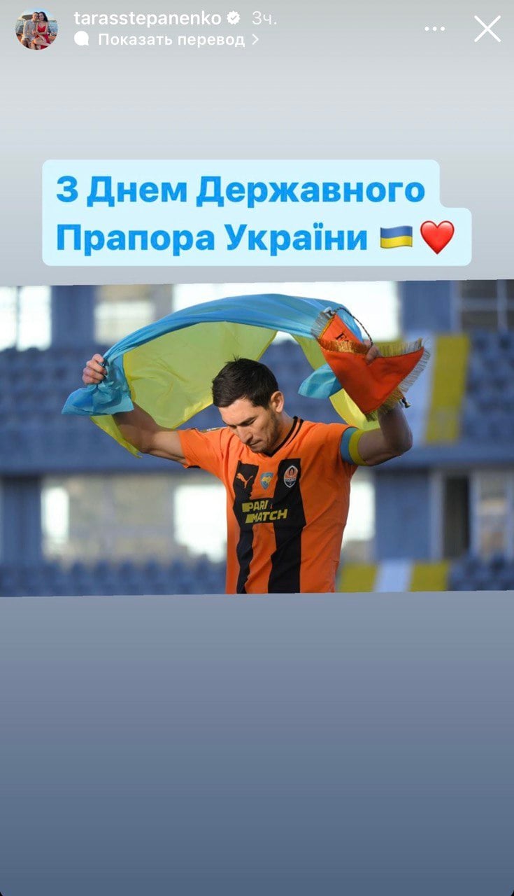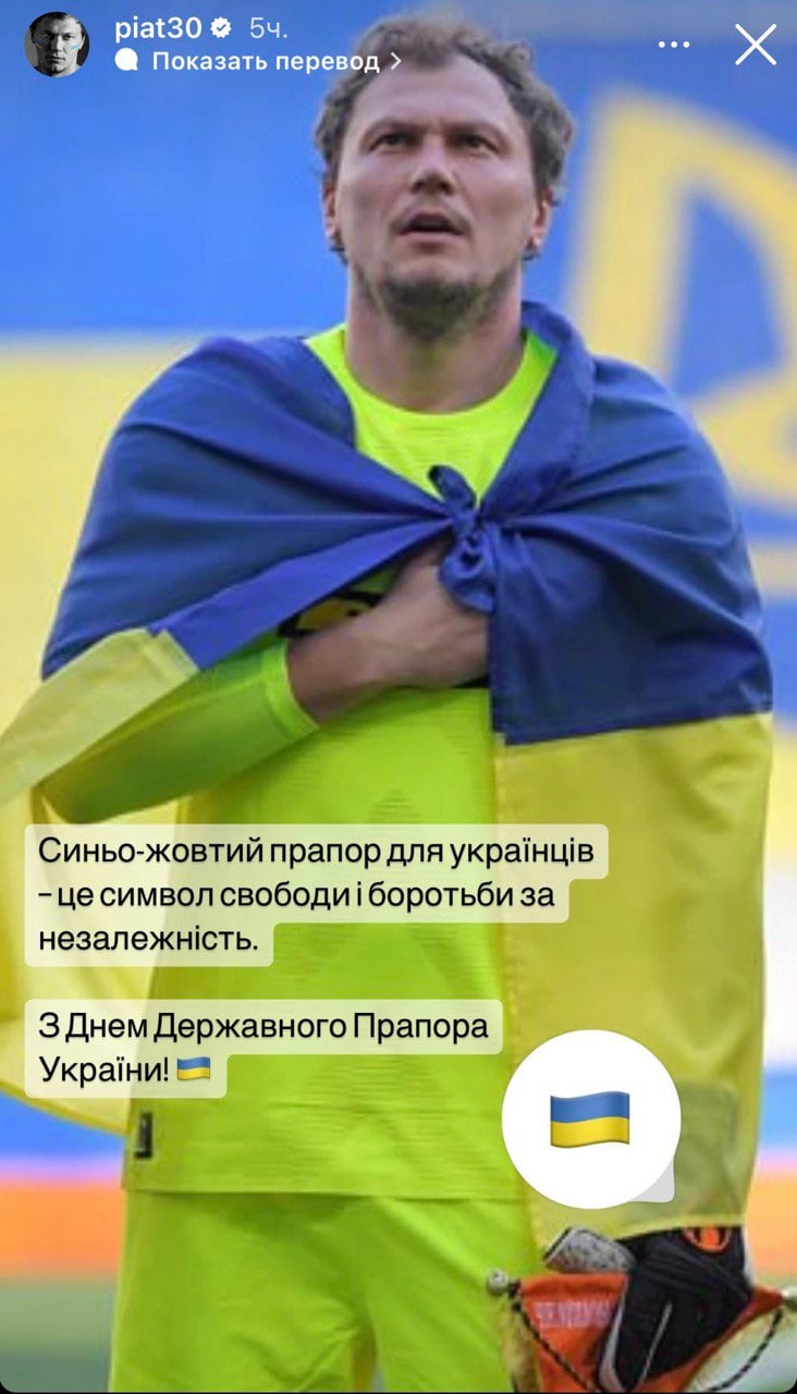 Віднедавна колишній голкіпер донецького Шахтаря і збірної України Андрій Пятов виклав в сторіс свого Instagram фотографію з прапором на плечах і написав, що він означає для всіх українців.
