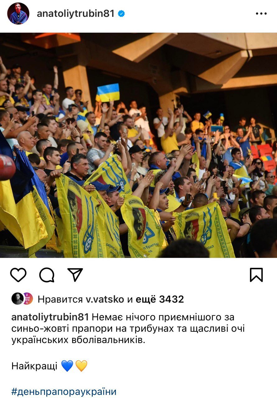 Але серед наших збірників були й ті, хто проявив креатив і написав кілька слів від душі. Наприклад, зробив це воротар тепер уже лісабонської Бенфіки Анатолій Трубін. У своєму Instagram він опублікував фото з українськими фанатами з прапорами в руках і підписав його так: