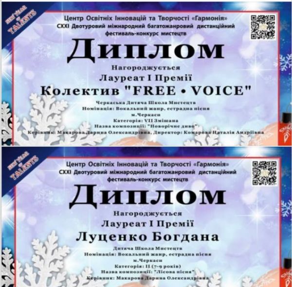 Вокальний колектив «FREE VOICE» та юна солістка Богдана Луценко з Черкаської дитячої школи мистецтв отримали дипломи Лауреатів І премії СХХІ Двотурового міжнародного багатожанрового дистанційного фестивалю-конкурсу мистецтв «NEW YEAR OF TALENTS».