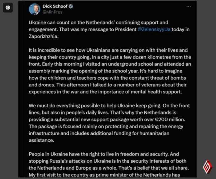 Що стосується допомоги, то саме Нідерланди, як власну ініціатива, оголосила про надання пакету допомоги на понад 200 мільйонів євро. Про це прем’єр-міністр повідомив на своїй сторінці в X.