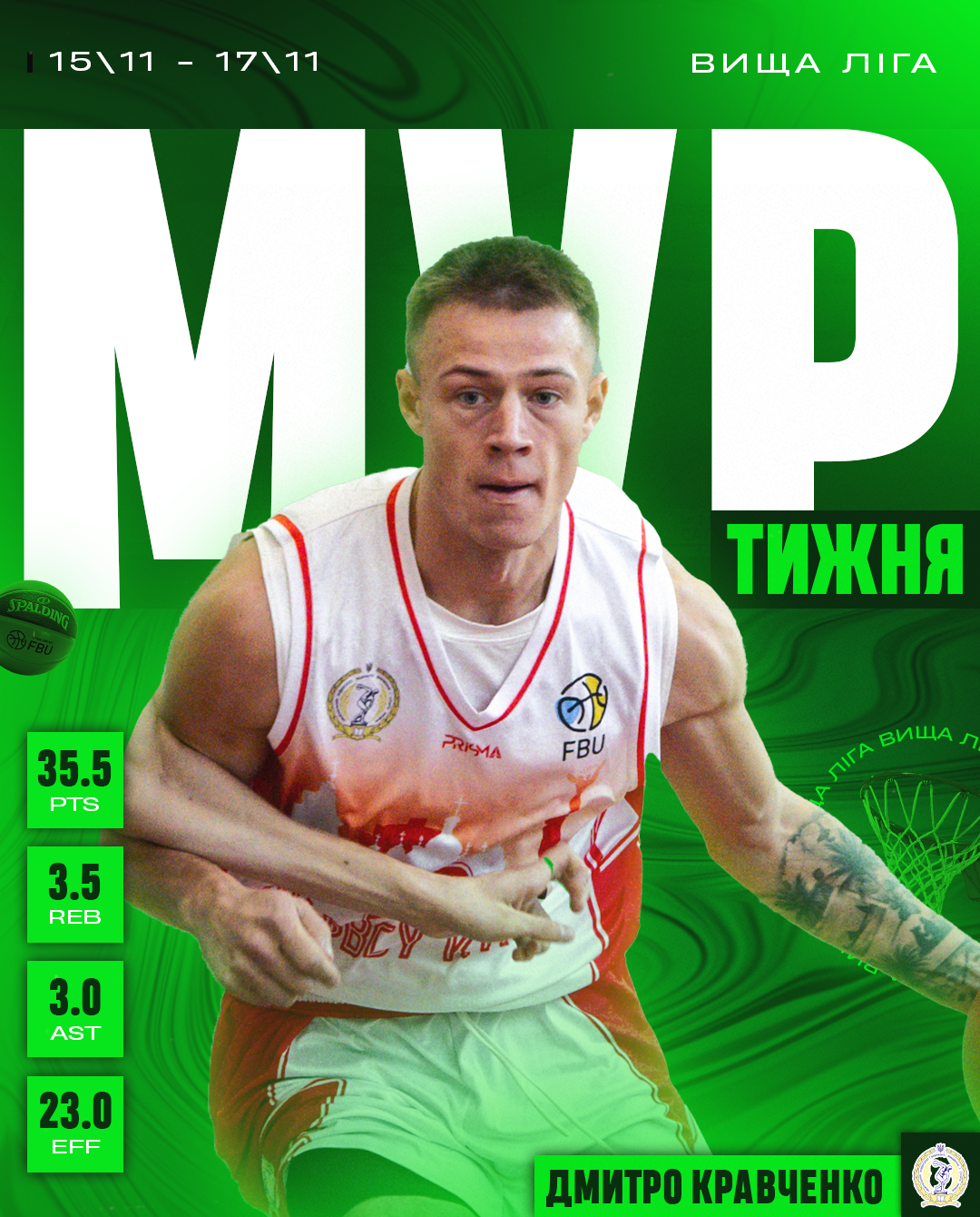 Дмитро Кравченко (НУФВСУ) – 35.5 очка, 3.5 підбирань, 3.0 передачі. РЕ 23.0