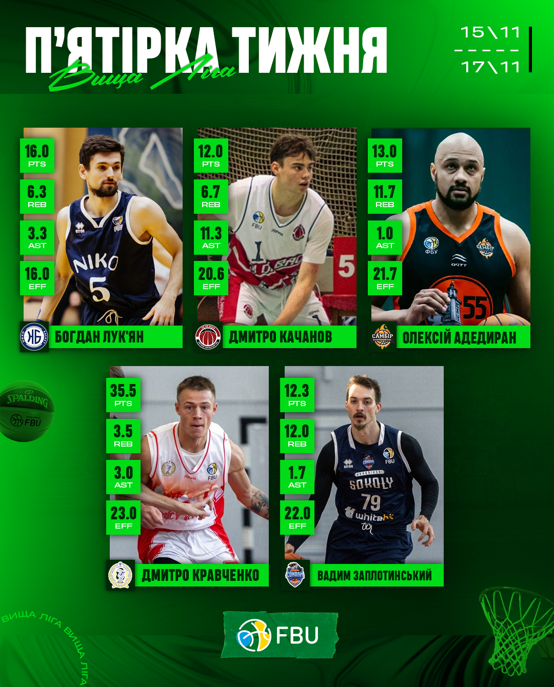 Богдан Лук'ян (Ніко-Баскет) – 16.0 очка, 6.3 підбирань, 3.3 передачі. РЕ 16.0