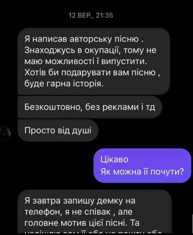 “Я написав авторську пісню. Сам зараз перебуваю в окупації, тому не маю можливості її випустити. Хотів би подарувати вам пісню – безкоштовно, без реклами. Просто так, від душі. Так як я перебуваю у Мелітополі, для своєї безпеки не можу поділитися інформацією про себе. До того ж, діючого паспорта у мене немає – він прострочений і вже не є документом”, – написав автор пісні у пропозиції VOVA CIGAN.