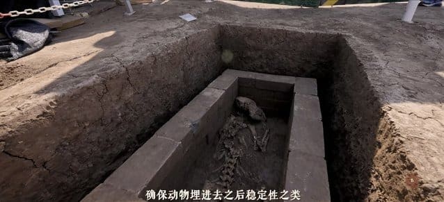 Повідомляється, що рештки тварини знайшли поруч із гробницею імператора Вень з династії Хань. Він правив у період зі 180 по 157 рр. до н.е. Поруч археологи виявили понад 380 земляних ям зі скелетами різних тварин. Ссавці лежали в дерев’яних трунах, птахи – у глиняних посудинах, зазначає видання.