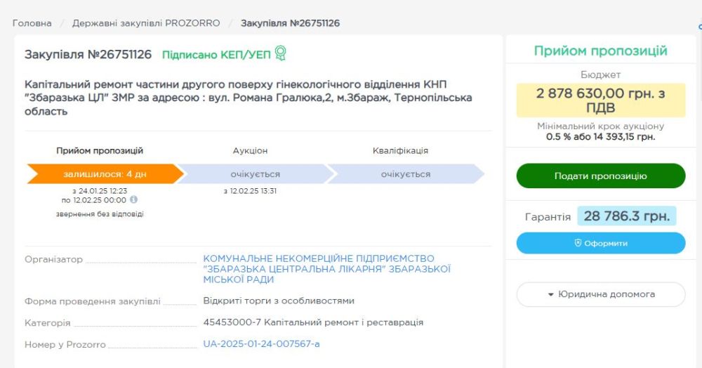 Тендер оголошено 24 січня 2025 року. Капітальний ремонт планується за  2 878 630,00 гривень з ПДВ. Переможця тендеру оголосять 10 лютого. Поки на сайті триває процес отримання заявок від підрядників. Згідно з тендером, завершиться капітальний ремонт 20 травня 2025 року.