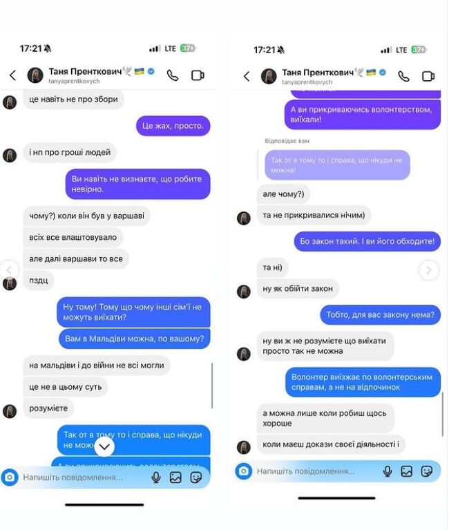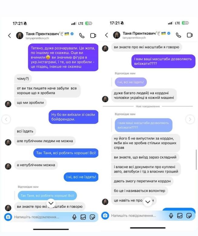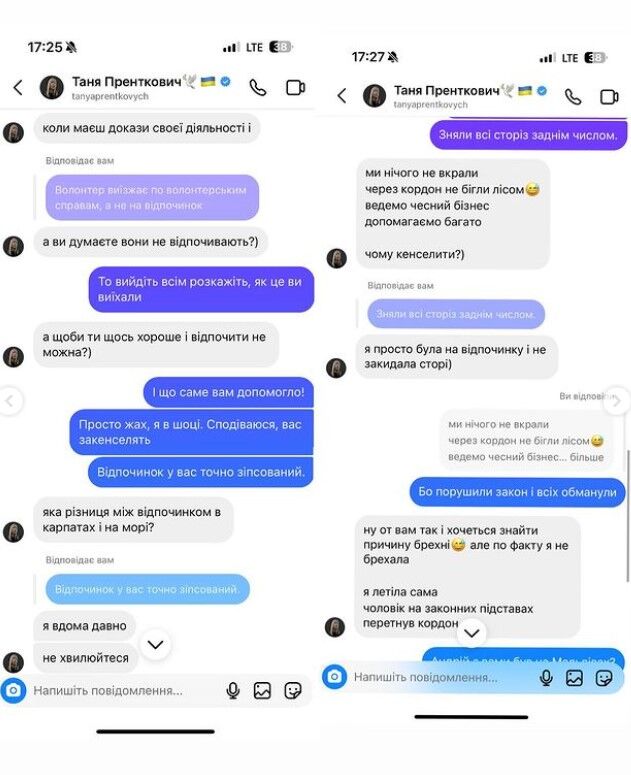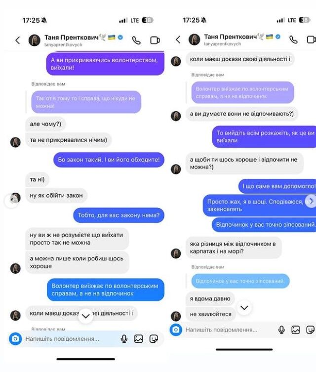 Блогерка надає скриштоти переписки з Танею Пренткович, на яких та уміло прикриває свого бойфренда, і каже, що він виїхав з країни, бо зробив багато доброго як волонтер. Вона розповідає про передані машини бійцям на фронт, гроші тощо. Проте все це просто “відмазки”, адже волонтерство дає можливість йому виїжджати за кордон як волонтер саме для волонтерських справ, а не для відпочинку на морі. Українці це добре розуміють, хоча Таня, здається, не дуже.