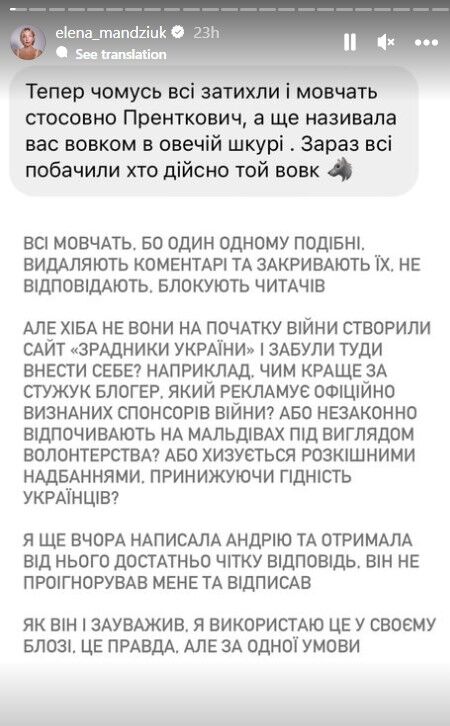 Свою позицію висловила ще одна блогерка-мільйонниця Олена Мандзюк