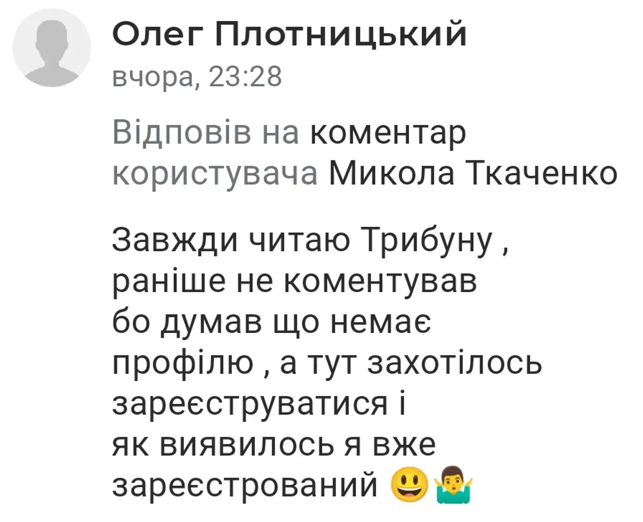 Подивившися історію коментарів користувача побачив, що Плотницький ще за часів вирування ковіду в Італії висловлювався досить активно. А тут прояснив деякі моменти, коли трибунівці почали будувати здогадки про конфлікти всередині головної команди країни. Приємно було бачити таку людину в обговоренні, тим паче Олег висловлювався грамотно, толерантно і що приємно українською. Хто хоче, почитайте гілку і зробіть свої висновки, а я зробив такі (підкреслюю, це було не інтерв’ю із конкретними запитаннями, а «живе» спілкування, тож треба вміти (чи намагатися) і читати між рядками):